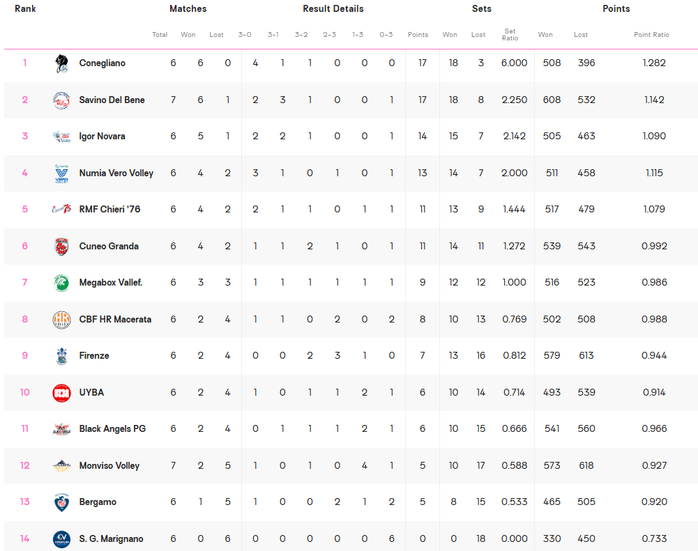 随着本轮落幕,意甲女排联赛第六轮全部战罢,卫冕冠军科内利亚诺以全胜战绩继续领跑积分榜,斯坎迪奇以6胜1负紧随其后,诺瓦拉5胜1负暂列第三。米兰、基耶里与库内奥同为4胜2负,分居第4至第6位,圣乔瓦尼遭遇六连败,仍在积分榜垫底。