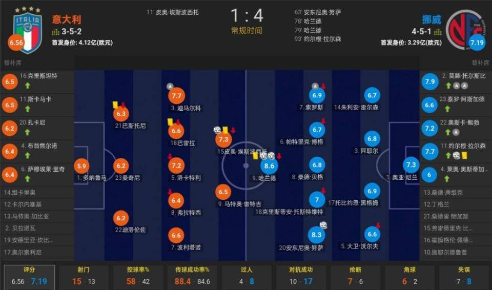 从全场数据来看,意大利队虽然占据了58%的控球率,并完成了15次射门,但只有4次射正。而挪威队则以13次射门,5次射正,打入4球,展现出了极高的进攻效率。这场比赛,无疑是挪威足球复兴的里程碑,也给意大利足球敲响了警钟。