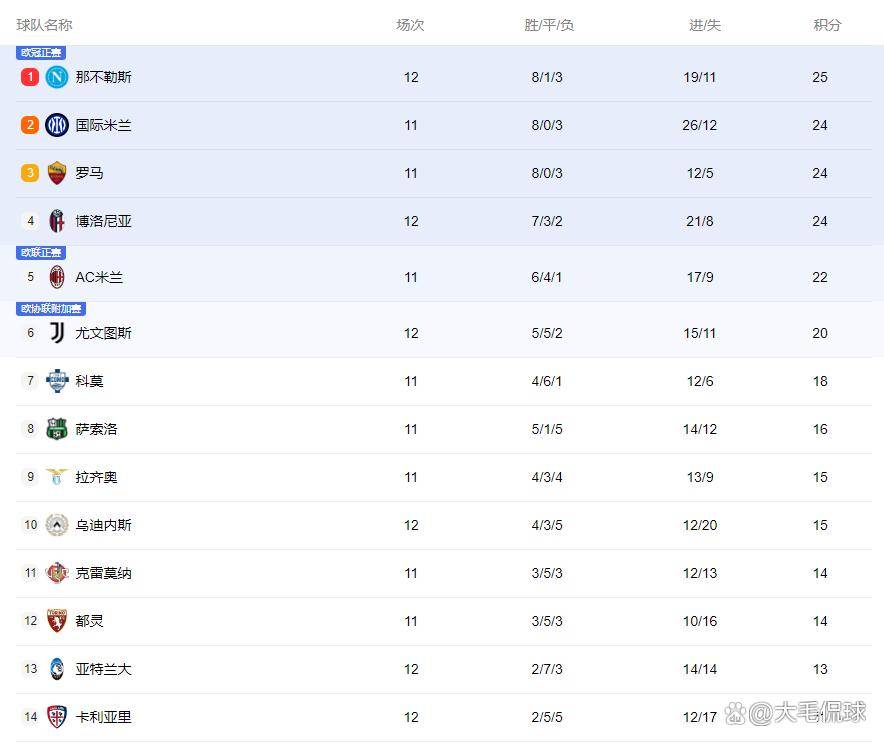 意甲第12轮战罢,积分榜呈现出近年来罕见的胶着态势。暂列榜首的那不勒斯积25分,身后紧跟着积分同为24分的国际米兰、罗马和博洛尼亚,他们都虎视眈眈,随时准备冲击榜首。AC米兰也以22分紧追不舍。至于传统豪强尤文图斯,尽管少赛一场,但20分的积分已让他们落后榜首5分,在争冠道路上显得有些吃力。