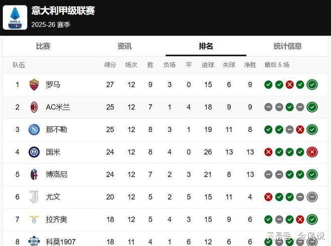意甲直播,意甲赛程,意甲积分榜,尤文图斯直播,意甲比分预测/面向中文球迷的意甲资讯平台,涵盖2025赛季完整赛程、免费高清直播入口、积分榜更新与竞彩波胆预测,聚焦尤文、国米、米兰三大豪门赛事。本赛季的意甲联赛呈现出了近年来少见的开放局面。截至第12轮,四支球队先后登顶积分榜,榜首的更替非常频繁。现在,罗马以27分排名第一,紧随其后的是AC米兰和那不勒斯,两队都积25分,而国际米兰与博洛尼亚则各自积24分,前五名球队之间的积分差距仅为3分,竞争异常激烈。