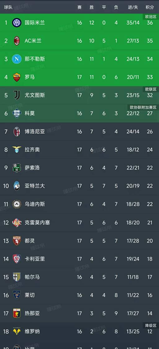 意甲直播,意甲赛程,意甲积分榜,尤文图斯直播,意甲比分预测/面向中文球迷的意甲资讯平台,涵盖2025赛季完整赛程、免费高清直播入口、积分榜更新与竞彩波胆预测,聚焦尤文、国米、米兰三大豪门赛事。北京时间12月30日,随着罗马队在主场以3-1战胜热那亚,意甲第17轮的所有比赛圆满结束。此轮比赛过后,联赛积分榜也随之更新,争夺形势愈发激烈。下面,我们来详细盘点一下目前各队的积分情况和表现亮点。