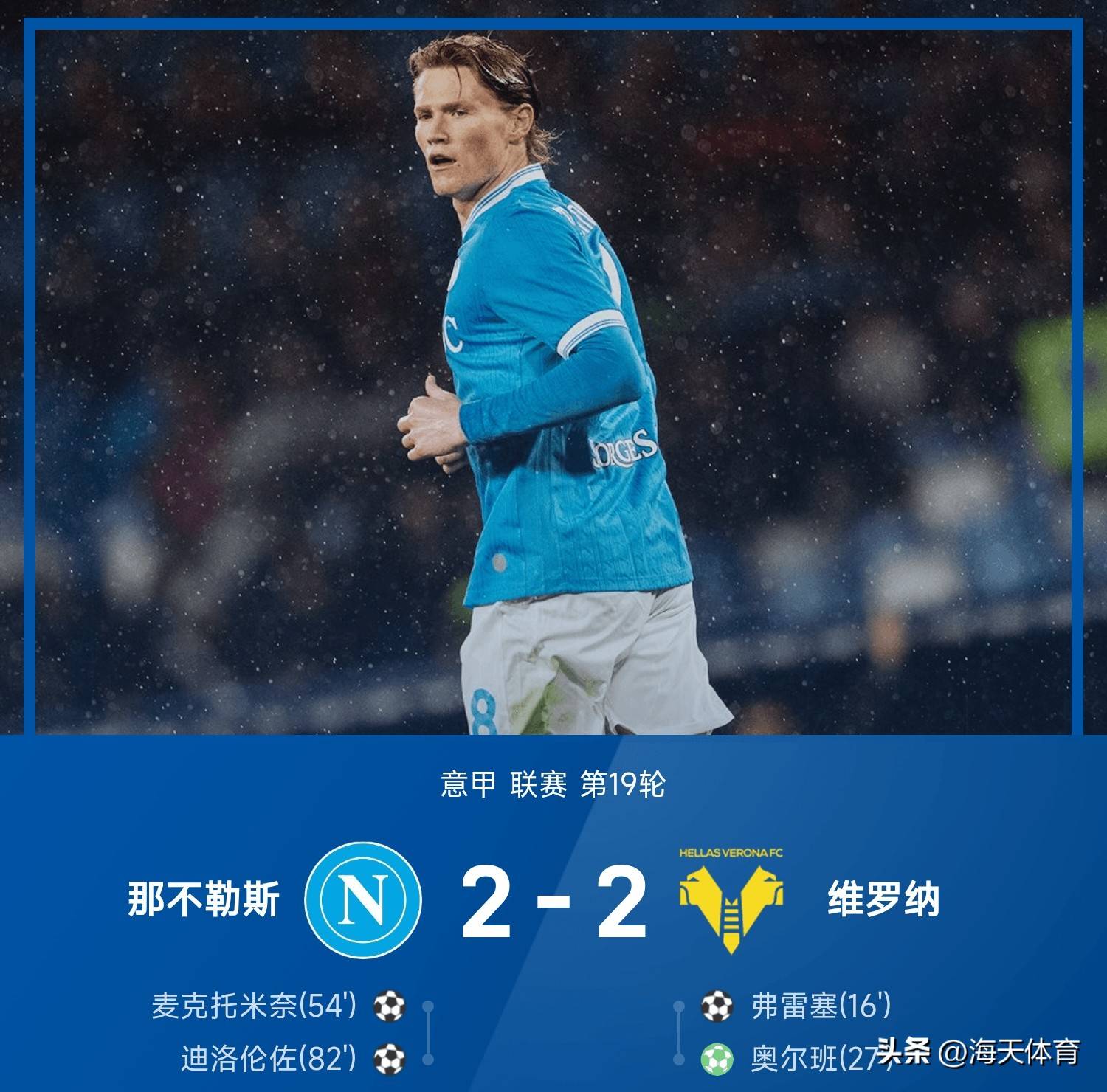 意甲直播,意甲赛程,意甲积分榜,尤文图斯直播,意甲比分预测/面向中文球迷的意甲资讯平台,涵盖2025赛季完整赛程、免费高清直播入口、积分榜更新与竞彩波胆预测,聚焦尤文、国米、米兰三大豪门赛事。1月8日 25/26赛季意甲联赛第19轮,那不勒斯2-2战平维罗纳。上半场第16分钟,弗雷塞破门帮助维罗纳取得领先,第27分钟奥尔班点射再下一城。易边再战,麦克托米奈第54分钟头球破门,将比分扳为1-2。随后霍伊伦5分钟内连续因手球、越位被吹两球。第82分钟,迪洛伦佐破门,将比分扳为2-2平,最终两队2-2握手言和。