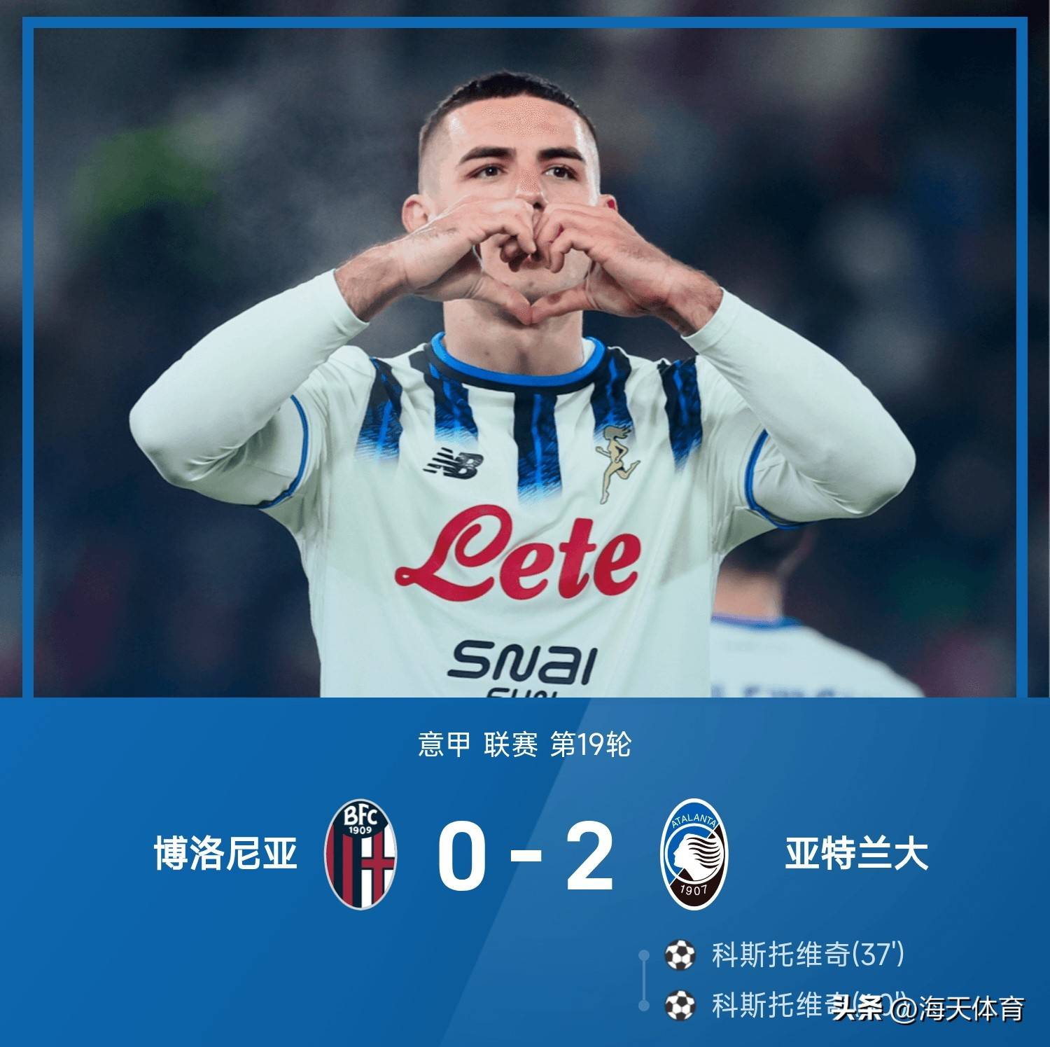 25/26赛季意甲联赛第19轮,亚特兰大2-0战胜博洛尼亚。上半场比赛,德凯特拉雷送助攻,科斯托维奇破门首开记录;下半时第60分钟,科斯托维奇凭借个人能力破门完成梅开二度;贝纳斯科尼禁区内疑似手球未判,最后时刻博洛尼亚主帅伊塔利亚诺不满裁判判罚染黄。