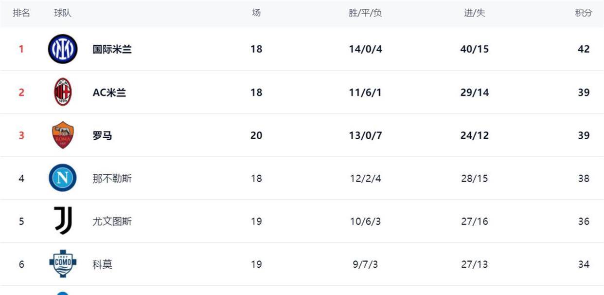 意甲直播,意甲赛程,意甲积分榜,尤文图斯直播,意甲比分预测/面向中文球迷的意甲资讯平台,涵盖2025赛季完整赛程、免费高清直播入口、积分榜更新与竞彩波胆预测,聚焦尤文、国米、米兰三大豪门赛事。意甲第20轮的比赛全部结束,积分榜的形势就像一锅被迅速搅动的沸水。 国际米兰依然以42分坐在头把交椅上,但身后的追赶者已经挤成了一团。 AC米兰39分,罗马同样是39分,但因为净胜球劣势排在第三。