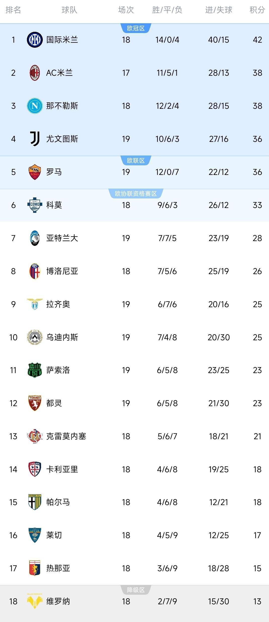 保级区的竞争同样激烈。 维罗纳虽然没能在那不勒斯主场全取三分,但拿到1分也让他们的积分达到13分,与佛罗伦萨持平。 比萨以12分垫底,这三支球队之间最大分差只有1分,每一场比赛都可能改变保级形势。