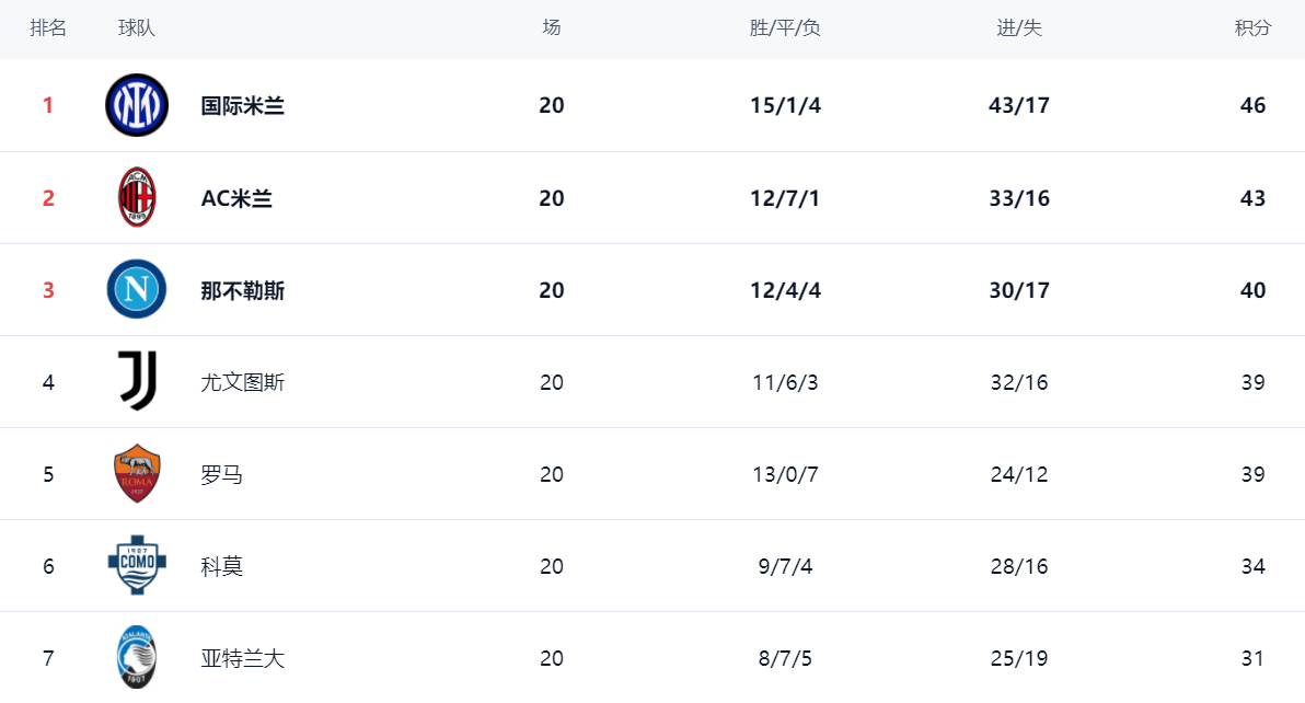 这场比赛也影响了争冠格局。国际米兰依然占据榜首位置,战绩是15胜1平4负,拿到46分。AC米兰赢球之后,总积分是43分,排名第2。前2的球队之间相差3分。显然,国际米兰和AC米兰这两支球队是夺冠大热门。卫冕冠军那不勒斯有些掉队了,只拿到40分排名第3。尤文图斯则以39分排名第4。返回搜狐,查看更多