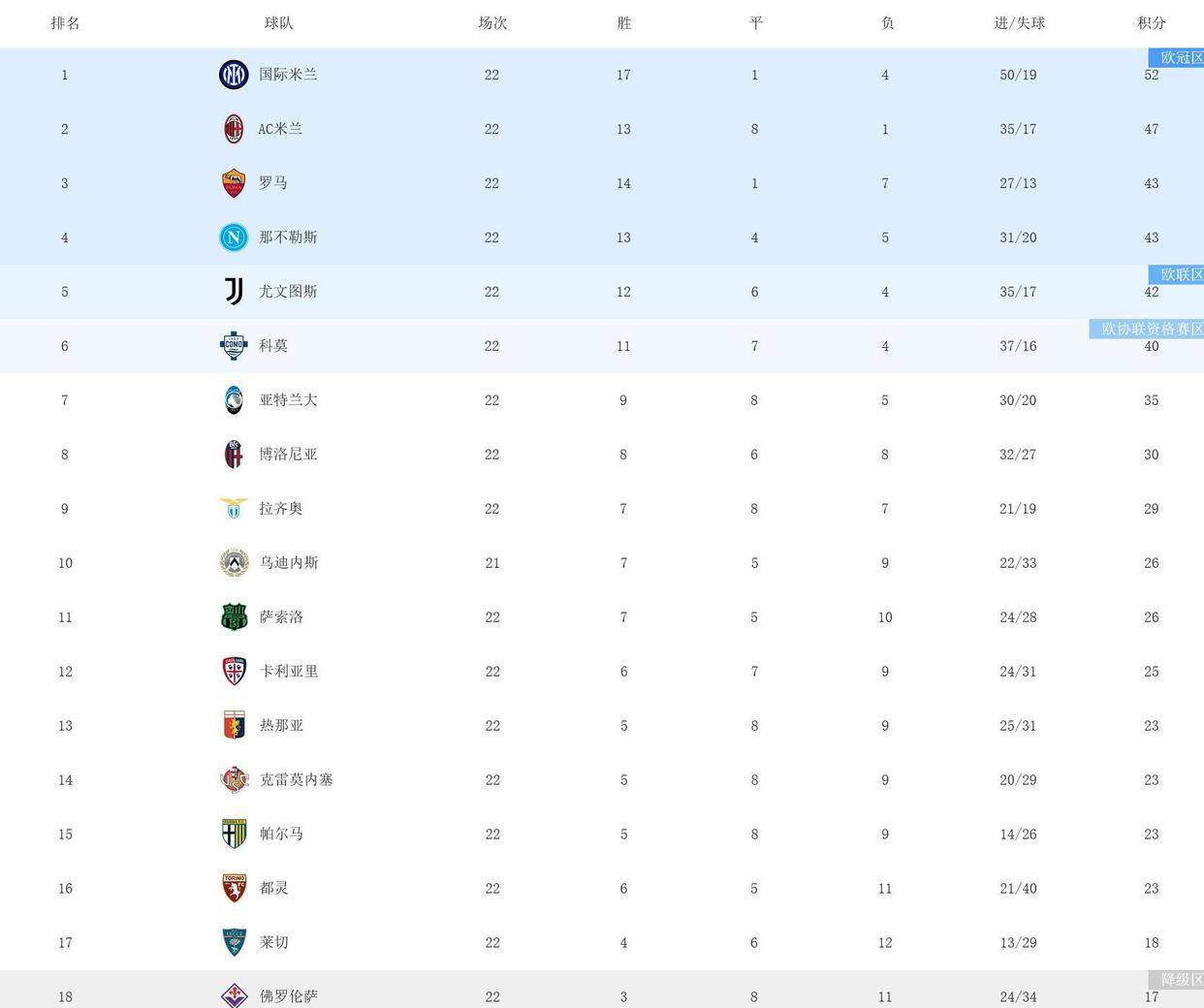 与此同时,罗马以45分排在第三,那不勒斯以44分位居第四。目前意甲积分榜前五名球队之间的分差仅有9分,争冠与欧冠资格的争夺异常激烈。