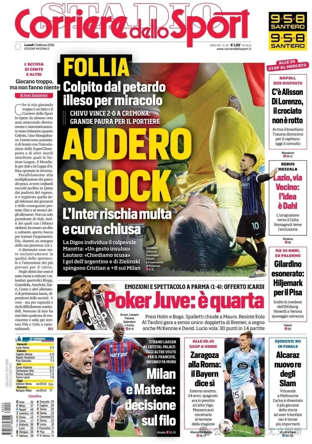 1、奥德罗,令人震惊。疯狂:被烟花击中,奇迹般安然无恙继续参赛。国米面临罚款和被关闭看台的风险。齐沃做客克雷莫内塞2比0获胜,这名守门员引发大恐慌。迪戈斯找到了罪魁祸首。马洛塔:“一种愚蠢的行为”。劳塔罗:“我们道歉。”阿根廷人和杰林斯基各进一球,让克里斯蒂安领先米兰到8分。