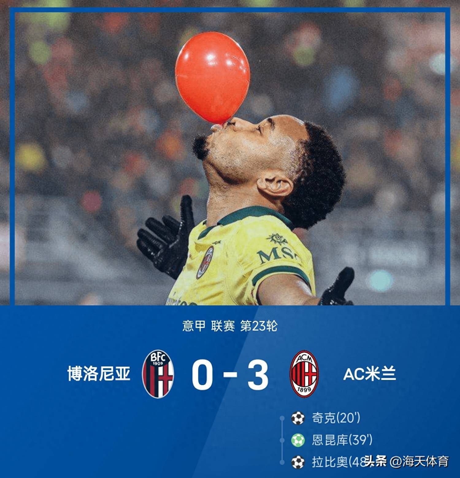 意甲直播,意甲赛程,意甲积分榜,尤文图斯直播,意甲比分预测/面向中文球迷的意甲资讯平台,涵盖2025赛季完整赛程、免费高清直播入口、积分榜更新与竞彩波胆预测,聚焦尤文、国米、米兰三大豪门赛事。2月4日 25/26赛季意甲联赛第23轮,AC米兰3-0战胜博洛尼亚。上半场比赛,奇克补射破门首开记录,随后拉瓦利亚出击送点,恩昆库主罚命中再下一城。下半场比赛,米兰达手抛球乌龙助攻,拉比奥推射破门锁定胜局。最终米兰3-0击败博洛尼亚,本赛季联赛对博洛尼亚完成双杀,米兰已保持22轮不败,继续排名联赛第二,距离榜首还有5分差距。