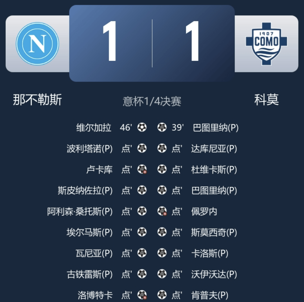 2月11日凌晨4时,意杯1/4决赛 那不勒斯坐镇马拉多纳球场迎战科莫。上半场,奥利维拉送点,巴图里纳主罚命中为科莫取得领先!半场战罢,那不勒斯暂0-1科莫;下半场,霍伊伦助攻维尔加拉破门扳平比分,之后双方再无进球!90常规时间比赛结束,那不勒斯1-1科莫!双方进入点球大战,那不勒斯卢卡库、洛博特卡点球不进,科莫佩罗内点球被扑!全场比赛结束,那不勒斯7-8科莫!