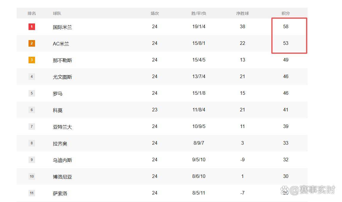 这场胜利对积分榜的影响是立竿见影的,AC米兰全取三分后,积分达到53分,继续稳坐积分榜第二位。而由于榜首的国际米兰本轮尚未比赛(他们将迎战尤文图斯),米兰与国米之间的分差从赛前的8分(米兰少赛一场)缩小到了5分。这意味着,如果国际米兰在随后的“国家德比”中失分,AC米兰的争冠希望将大幅增加。阿莱格里在赛后也轻松地表示,接下来可以“吃着饭,看国米尤文的比赛了”。