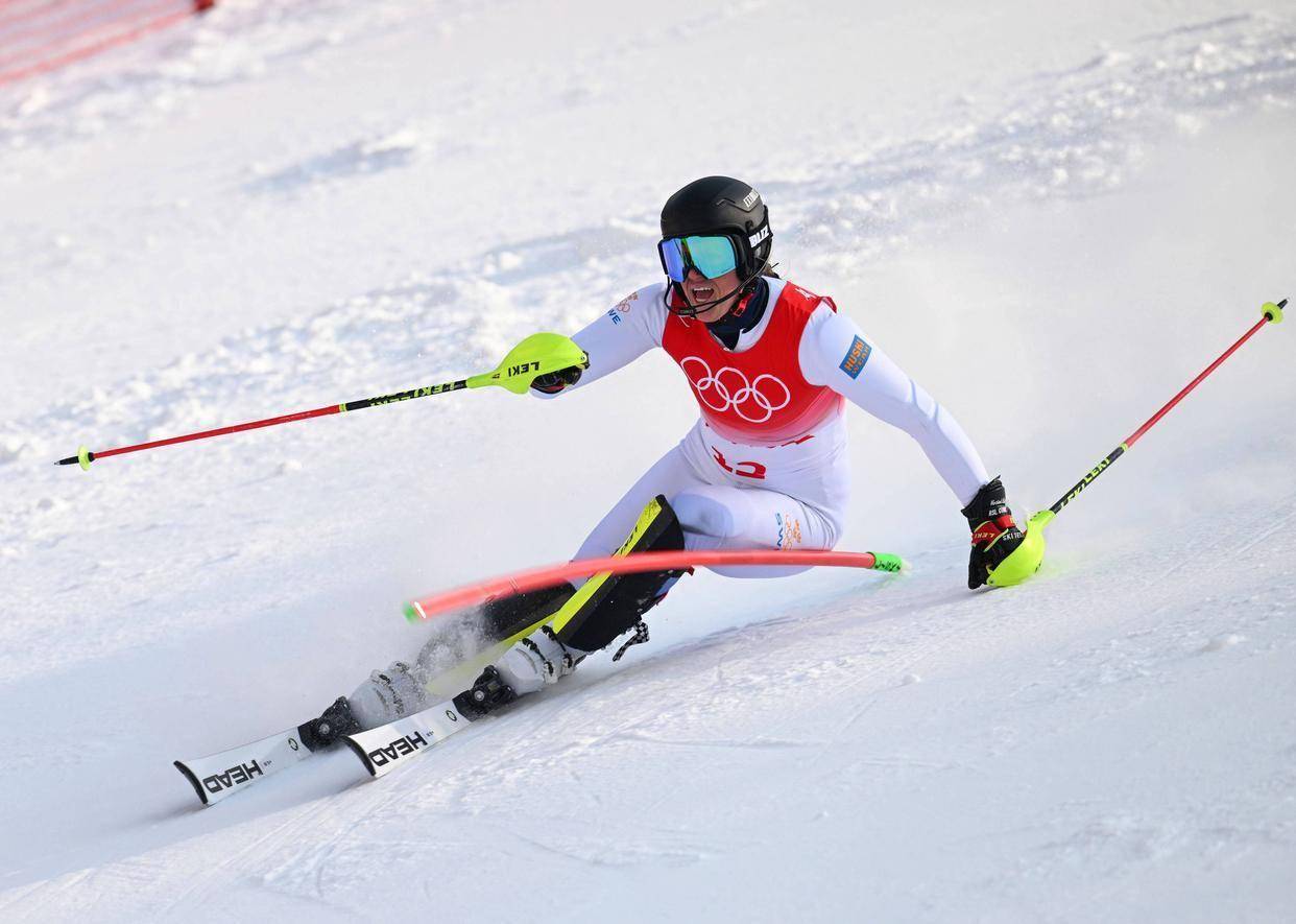 第六位出发的意大利选手费代丽卡·布里尼奥内头戴印有老虎图案的头盔,从起点猛冲而下。她的滑行线路精准而大胆,在中段的高速“S”弯几乎没有任何减速。冲过终点线。这个成绩成为了全场唯一一个进入1分23秒5以内的成绩,像一根金色的标杆,立在了所有后续选手面前。