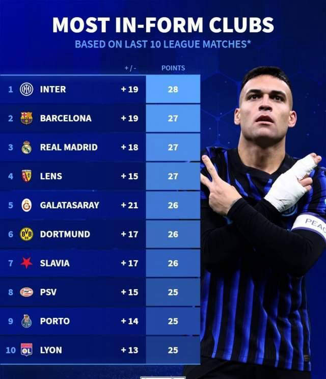 德国转会市场(Transfermarkt)最新统计显示,在欧洲顶级联赛中,各队最近10轮比赛的积分表现排行中,国际米兰凭借28分高居榜首,彰显出强势且稳定的竞技状态。紧随其后的是西甲豪门巴塞罗那和皇家马德里,两队均取得27分,与法甲劲旅朗斯并列第二。国米的统治力和持续抢分能力赢得了广泛关注,证明他们目前的状态堪称欧洲顶尖水平,展现出冲击赛季目标的有力姿态。