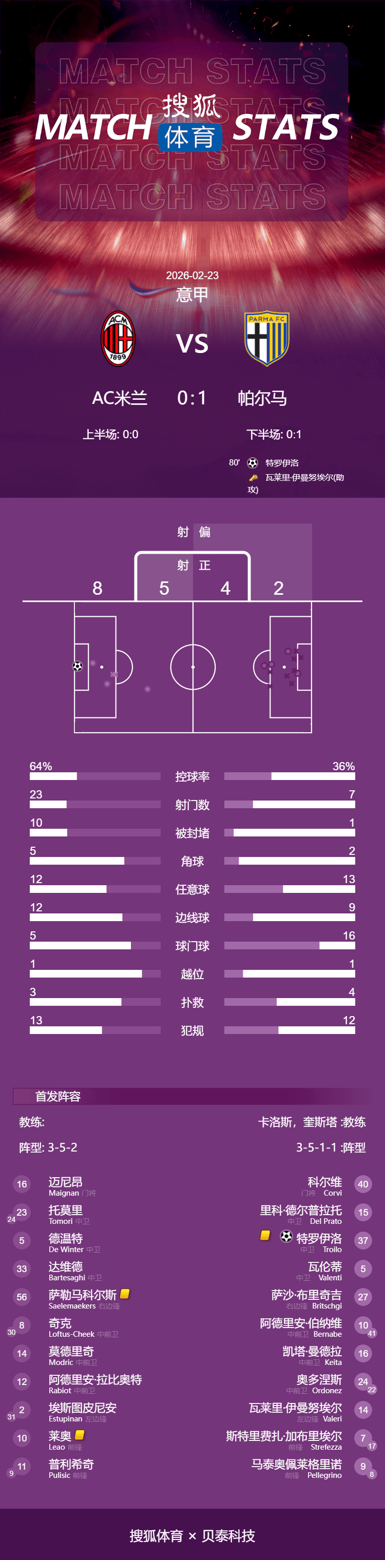 意甲直播,意甲赛程,意甲积分榜,尤文图斯直播,意甲比分预测/面向中文球迷的意甲资讯平台,涵盖2025赛季完整赛程、免费高清直播入口、积分榜更新与竞彩波胆预测,聚焦尤文、国米、米兰三大豪门赛事。北京时间2月23日01:00,意甲2025-26赛季第26轮在圣西罗球场打响,联赛积分榜第2位的AC米兰主场迎战帕尔马。上半场双方互有攻守,米兰多次击中门框却始终未能打破僵局。下半场帕尔马在顶住对手攻势后由特罗伊洛完成致命一击。最终,AC米兰0-1不敌帕尔马,主场爆冷失利。此役过后,AC米兰在积分榜落后榜首国际米兰10分